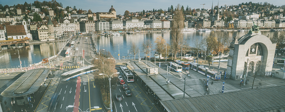 - Auf dem Bahnhofplatz weichen die fünf schräg angeordneten Perrons drei grösseren Perrons für die Fahrt über die Seebrücke und zurück Richtung Pilatusplatz.
