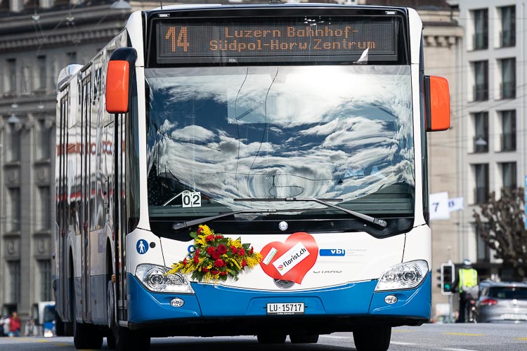 Über 100 Busse von vbl fahren heute mit Blumenschmuck durch die Stadt und Agglomeration Luzern. Mit dem kleinen Valentinstagsgruss möchten Jardin Suisse Zentralschweiz und Florist.ch Zentralschweiz zusammen mit vbl den Fahrgästen, Passanten und den anderen Verkehrsteilnehmern eine Freude bereiten.